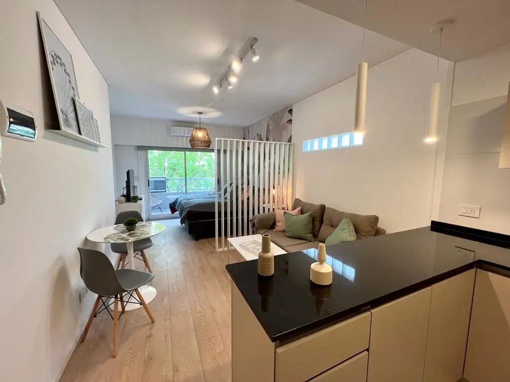 El departamento cuenta con un amplio ambiente con salida al balcón, ideal para disfrutar de momentos al aire libre. cuenta con cocina, una hermosa mesada de granito y está equipada con muebles bajo mesada y alacenas, brindando un espacio perfecto en cuanto a comodidad y practicidad.