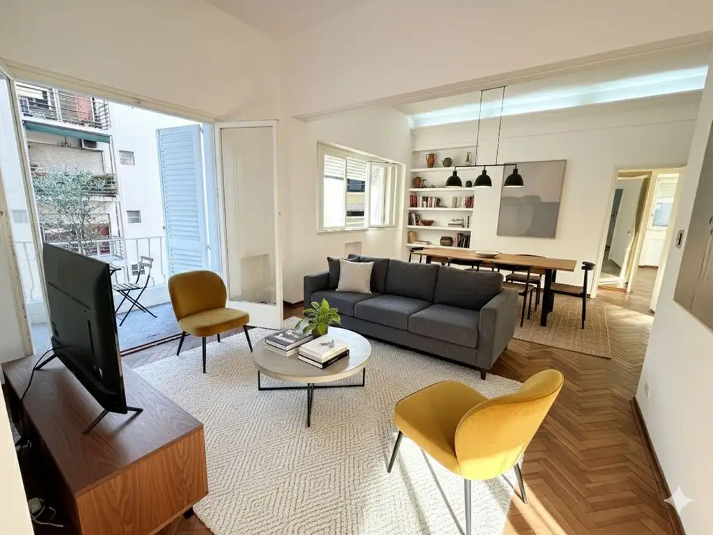 Luminoso living, con piso de madera y acceso a un balcón con vista al frente. (La primera ilustración es hecha con IA como posible decoración y distribución). Desde allí se accede a la cocina-comedor, de doble circulación, equipada con calefón y espacio para lavarropas o bacha de lavado.