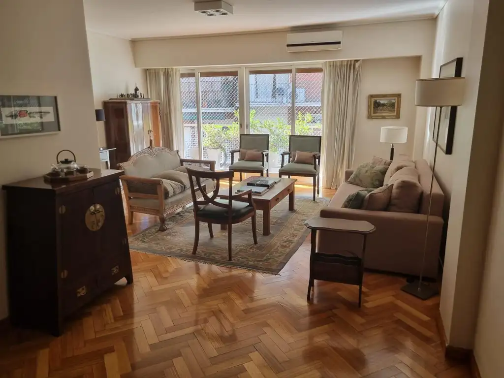 El área privada se compone de tres dormitorios bien proporcionados, todos con placard, más dos baños completos. La unidad se encuentra en muy buen estado general, con pisos de parquet en excelente conservación y detalles clásicos que aportan calidez.