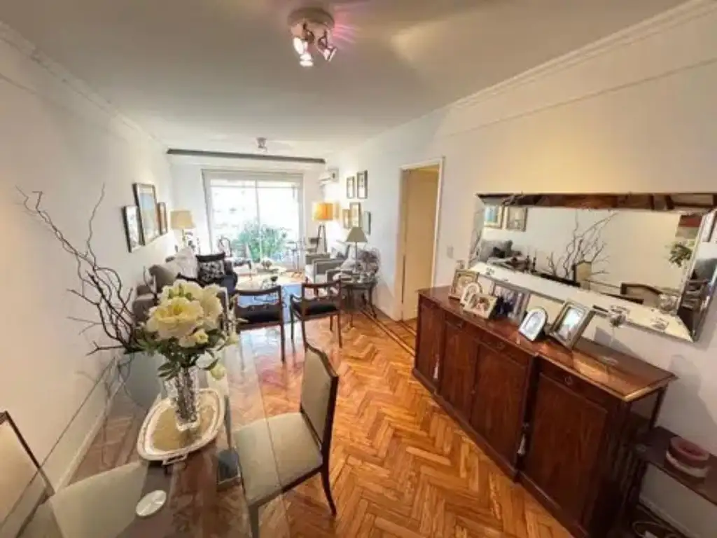 El departamento cuenta con un baño completo y un toilette de recepción, con revestimientos y griferías de calidad, uno de ellos en suite con la habitación principal. El estado general de la unidad es muy bueno, con pisos de parquet en perfecto estado, calefacción individual y detalles de categoría que aportan confort y estilo.