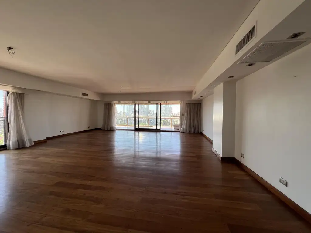 Venta con renta. Superficie cubierta de 221,42 m2 + Superficie semicubierta de balcón lateral de 3,21 m2 + Superficie balcón terraza de 20,77 m2 cubierto con cerramiento. Super luminoso y en impecable estado con doble circulación. Ascensor y entrada de servicio. Hall de entrada con 2 ascensores principales. Gran living comedor con ventanales, pisos de madera tarugada y placard espejado. Amplio balcón terraza con deck de madera y cerramiento corredizo balconfort, con hermosa vista abierta a Parque Las Heras y el Río. Toilette de recepción. Dormitorio principal con baño en suite con hidromasaje y amplio vestidor. Dos dormitorios, también con baños en suite y placares. Cuarto dormitorio o escritorio. Cocina independiente a nuevo con mesada de silestone blanco, doble bacha de acero inoxidable y office. Comedor diario con ventanal y alacenas. Lavadero independiente. Dependencia de servicio con baño. Se entrega pintado y con pisos plastificados. Dos cocheras fijas cubiertas y gran baulera. Calefacción y aire acondicionado central por planta. Acceso con Seguridad 24hs.