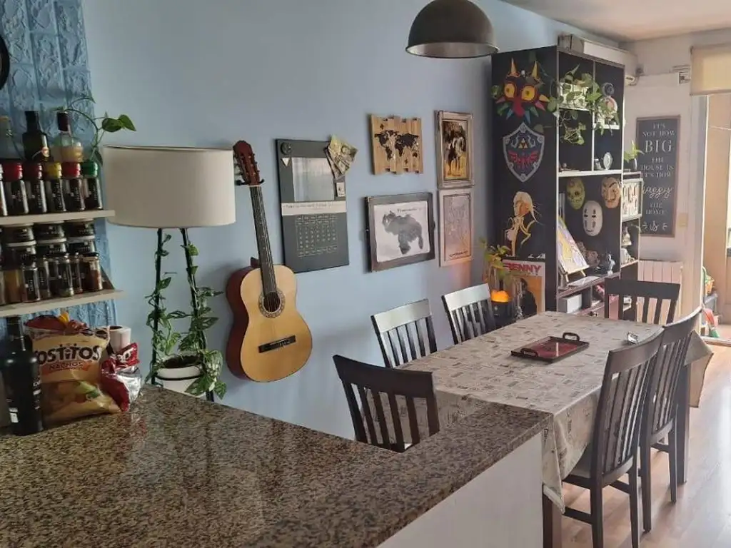 El living comedor, de generosas dimensiones, cuenta con salida a un balcón al contrafrente abierto, ideal para disfrutar de un espacio exterior tranquilo. Los pisos flotantes se encuentran en impecable estado y aportan calidez al ambiente. La cocina está semiintegrada, equipada con barra desayunadora, artefacto de cocina a gas con horno y conexión para lavarropas.
