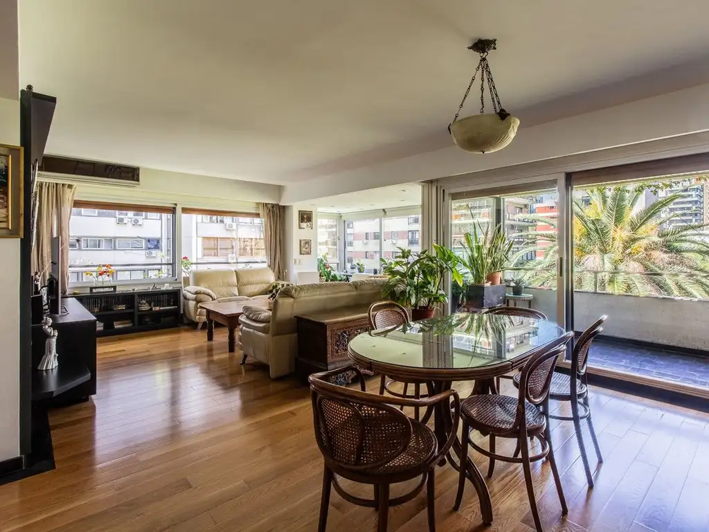- Living-comedor muy espacioso y luminoso, con pisos de roble americano en excelente estado, amplios ventanales con carpintería línea Módena, persianas de madera, dos aires acondicionados frio/calor y salida al balcón. Escalera revestida también en roble americano.