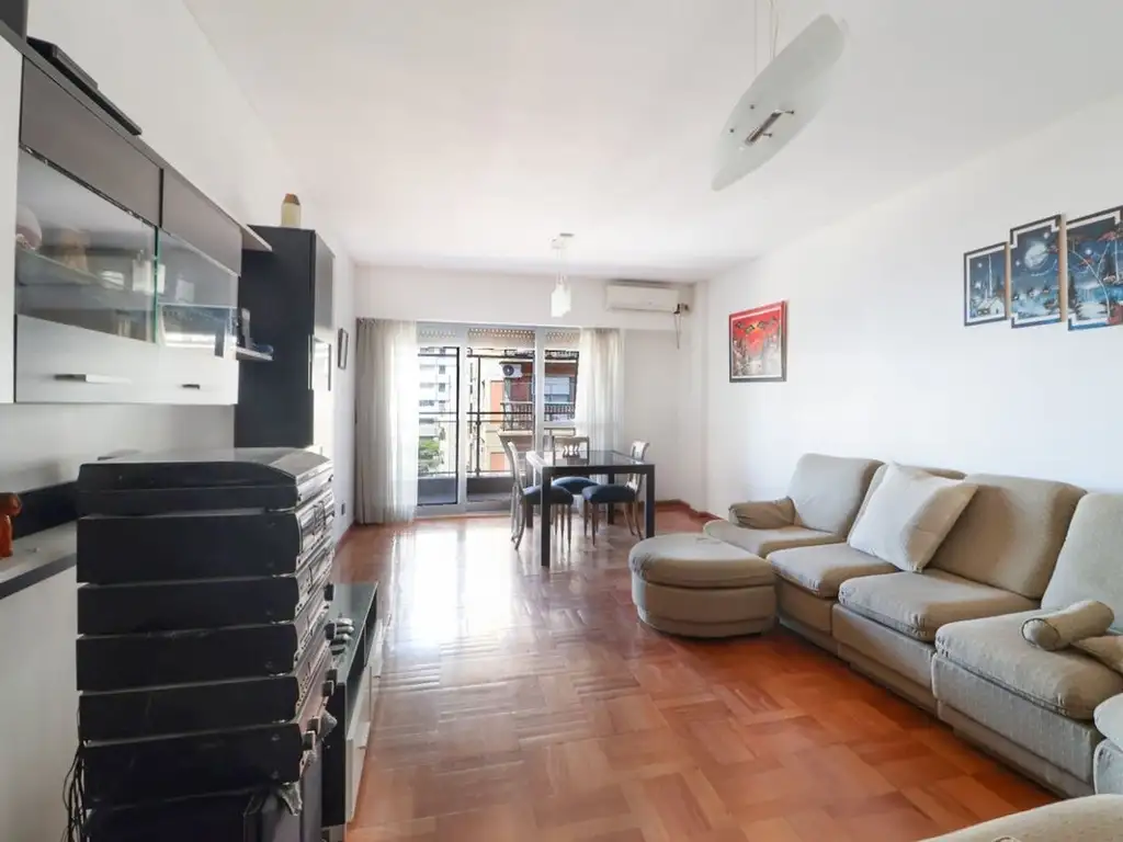 Orientación noreste que garantiza iluminación natural durante gran parte del día. El departamento conserva un estado general muy bueno, producto de un mantenimiento cuidadoso desde su construcción en 1981 y renovación en 2014. Incluye una cochera, elemento diferencial para quienes valoran el estacionamiento propio en esta zona de alta densidad urbana.