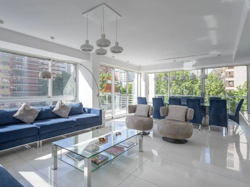 Triplex ultimo piso con terraza, jacuzzi y parrilla propia. Muy luminoso, luz natural. Primer planta con palier privado. Amplio living comedor con balcón terraza al frente, orientación norte. Toilette y placard de recepción. Cocina amplia, con ventilación natural. Dependencia de servicio. Ascensor propio. Segunda planta: 2 dormitorios al frente cada uno con su baño privado. Un escritorio. Una suite principal con balcón terraza al contrafrente, vestidor, baño completo con jacuzzi y ducha escocesa. Tercer Planta: terraza de uso exclusivo con parrilla al frente, baño, lavadero, y al contrafente amplia deck con ducha y jacuzzi. Vista abierta al frente y al contrafrente en los tres pisos. 4 cocheras juntas, fijas, cubiertas y una baulera grande en el 1er subsuelo. Losa Radiante. Aires acondicionados frio/calor en todos los ambientes. Camaras y Seguridad Totem. Amenities: Jardin, Pileta y varias cocheras de cortesía. Encargado con vivienda. - Las medidas son aproximadas y orientativas. Las medidas exactas surgirían del titulo de propiedad.-