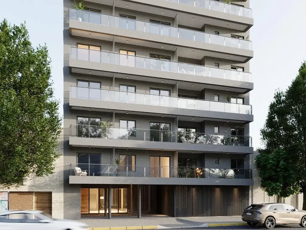 Edificio moderno con hall de acceso vidriado, ascensores automáticos y cocheras disponibles.