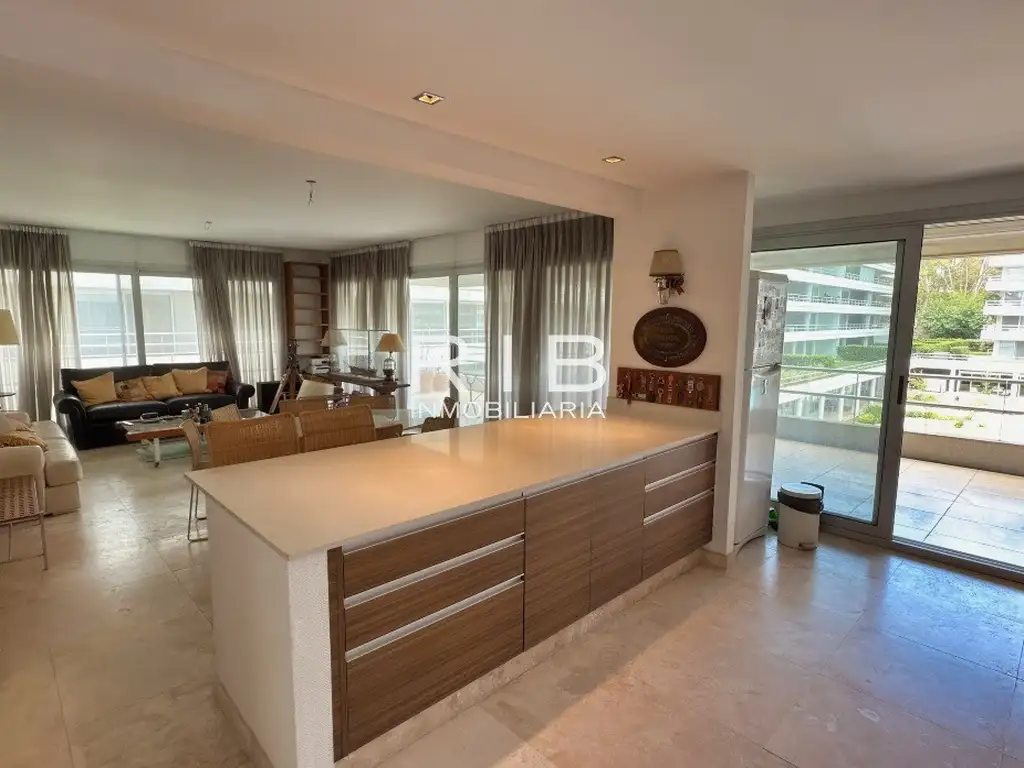 Departamento con vista a las Piscinas, desarrollado en 139 m2 cubiertos, 42 m2 semicubiertos y 2 cocheras (25 m2, 1 subterránea y 1 descubierta). Pisos en mármol, calefacción por piso radiante, aire ac tipo split y aberturas en aluminio doble vidrio. Encontramos amplio living y comedor integrados con salida al balcón terraza con parrilla. Cocina con amoblamientos y barra. Toilette de recepción. Una luminosa suite principal con vestidor. Luego dos dormitorios con placares y un baño completo.