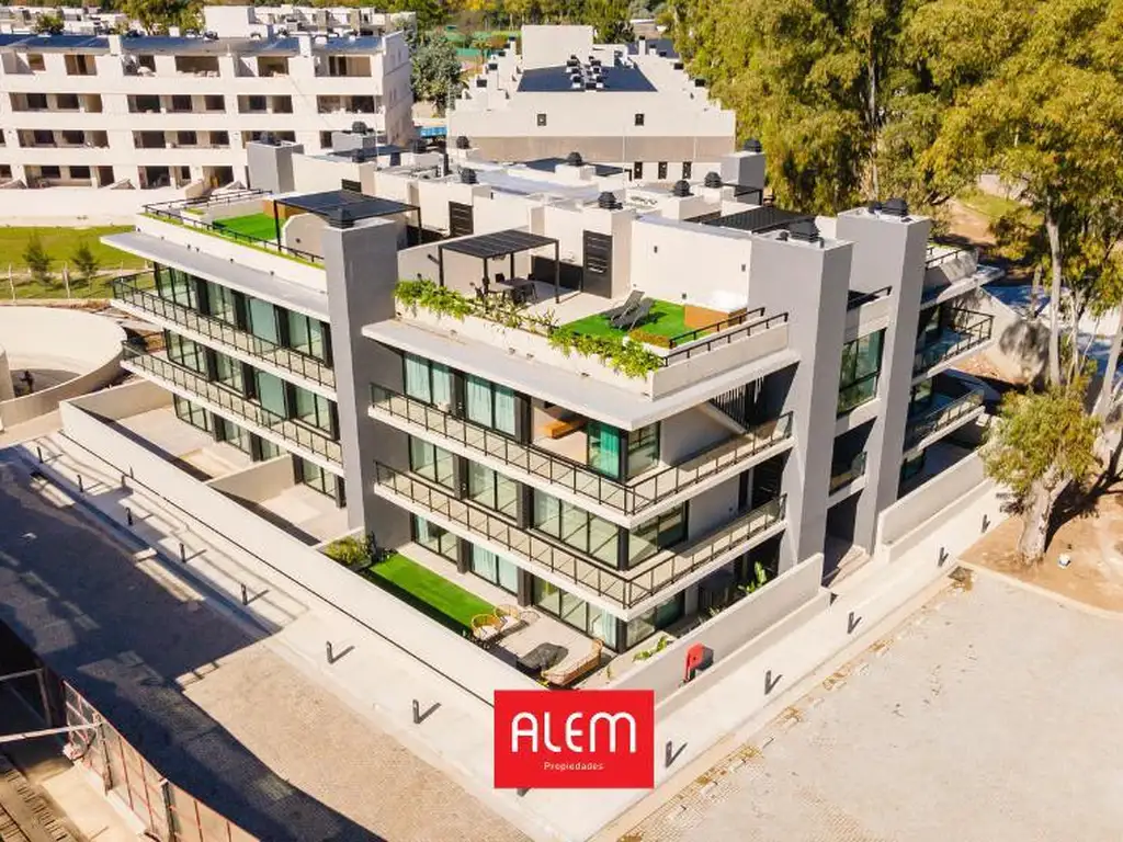 Complejo residencial compuesto de 6 torres de 3 y 4 pisos, con amplias terrazas que ofrecen vistas panorámicas a los alrededores.