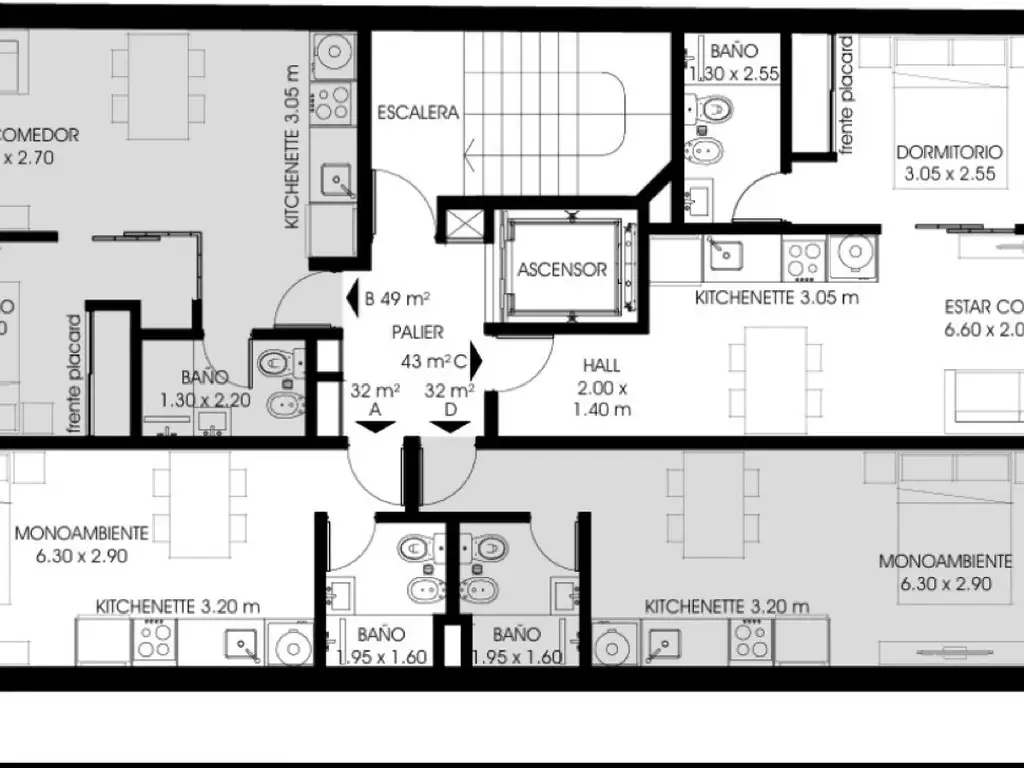 Edificio en construcción de planta baja, 8 pisos y terraza, compuesto por 4 departamentos por piso. Cuenta con unidades de 1 dormitorio, monoambientes, oficinas adaptables a departamentos de dos dormitorios, un local comercial y espacio de cocheras y un quincho de uso común más otro de uso exclusivo en azotea. Detalles constructivos: Placards con frente terminado. Baños completos con espacio de ducha, vanitory y griferías FV o similar. Pisos y paredes revestidos con cerámicos en baño, cocina y balcón. Pisos, zócalos de madera flotante en estar comedor, dormitorios y pasos. Paredes y cielorrasos enduídos en yeso. Aberturas exteriores en aluminio con doble vidrio hermético, línea aluar o similar. Mesadas de cocina de mármol y bacha de acero inoxidable con grifería FV o similar. Alacenas y bajo mesadas en madera completamente instalados. Cocina a gas y termotanque eléctrico instalados.