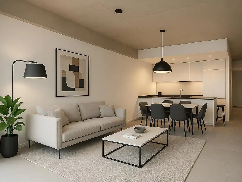 Ingreso al semipiso por ambiente único, amplio y luminoso que conecta la cocina con el living comedor con salida al balcón al frente con orientación Este.
