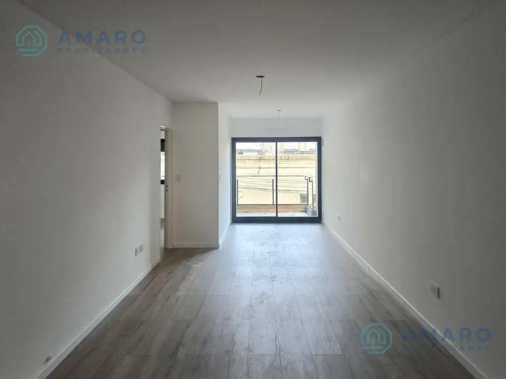 Carpinterías de aluminio línea Módena con doble vidrio; en dormitorios, persianas de enrollar. Pisos flotantes de madera en estar y dormitorio; porcelanato en cocina, baño, balcones y espacios comunes.