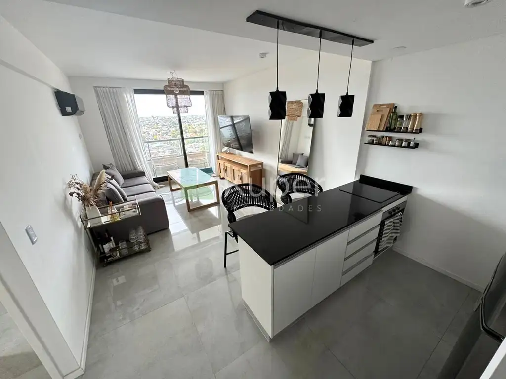 La unidad cuenta con un living comedor con cocina integrada y barra desayunadora + balcón con vista directa al río. El living tiene cortinas blackout y de gasa instaladas.