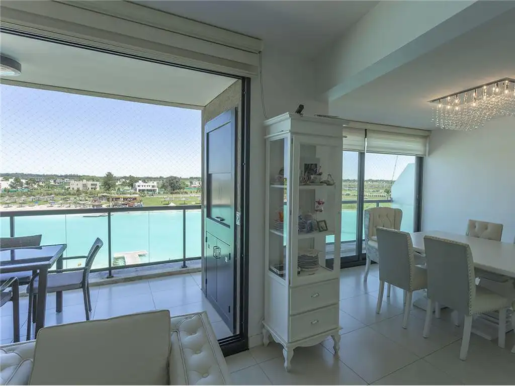 El departamento cuenta con dos plantas, en ambas posee salida desde todos los ambientes a grandes balcones terrazas hacia la Laguna. Se ingresa a un gran living, con toilette de recepción y cuarto de guardado. El living esta integrado a la cocina comedor. La cocina con isla con mesada de mármol, con muebles bajo mesada y alacena. El balcón terraza tiene parrilla empotrada con puerta de hierro y un amplio espacio para un comedor semicubierto. Toda la vista abierta de la planta al turquesa de la laguna hacen soñado a este gran ambiente. Por la escalera accedemos a la planta alta, al hall distribuidor, para dar acceso a dos habitaciones en suite. La suite principal con vestidor y baño con doble bacha, bañera y ducha flor. La segunda habitación también con baño en suite completo y placard empotrado. Ambas habitaciones con salida a un inmenso balcón terraza con vista panorámica a la laguna. Cuenta con 2 cocheras, y laundry en el edificio.