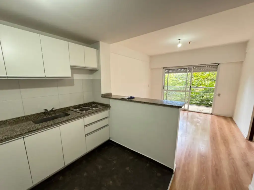El departamento de 50m2, ubicado al frente y con orientación sur, se desarrolla en una planta funcional y luminosa. Cuenta con living comedor con cocina integrada, equipada con mobiliario de guardado de melamina blanca y barra desayunadora, mesada de granito, bacha de acero inoxidable, grifería mono comando, anafe eléctrico. Salida al balcón corrido perfecto para disfrutar del aire libre, abertura con persianas.