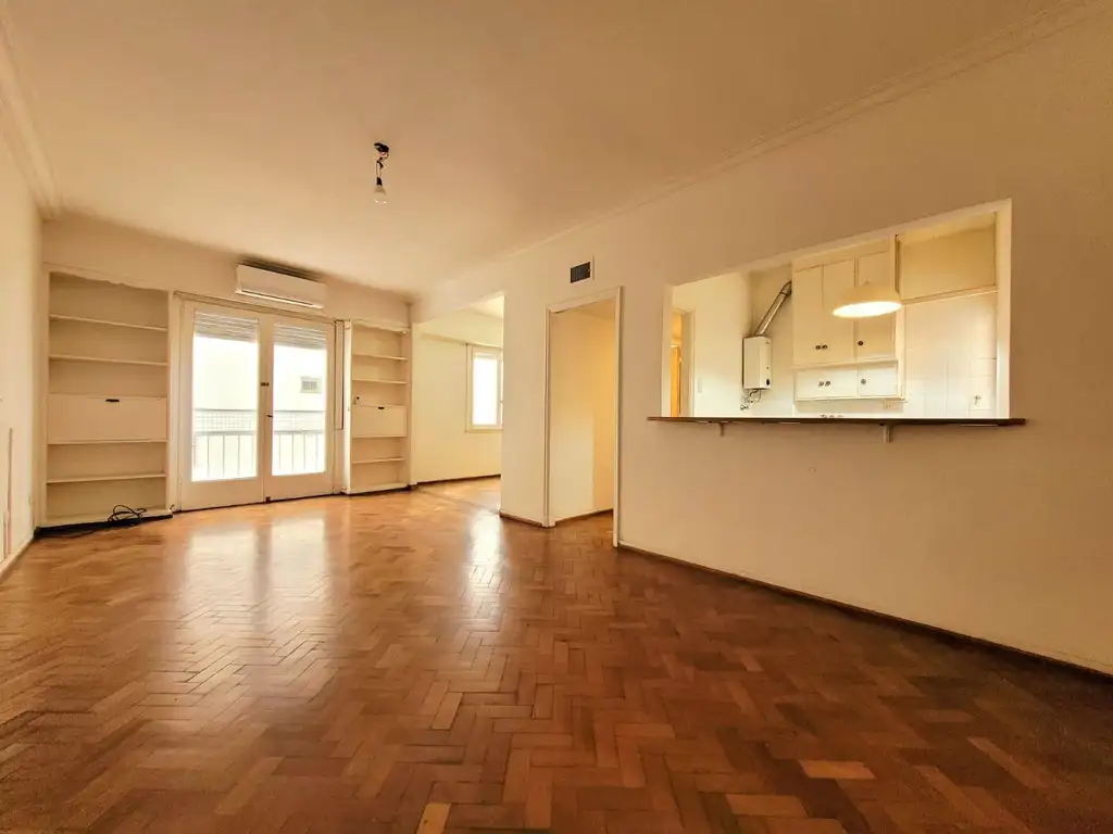 Amplio y luminoso living comedor con vista a puerta ventana al exterior, pisos de parquet en espiga en excelente estado y estanterías empotradas que