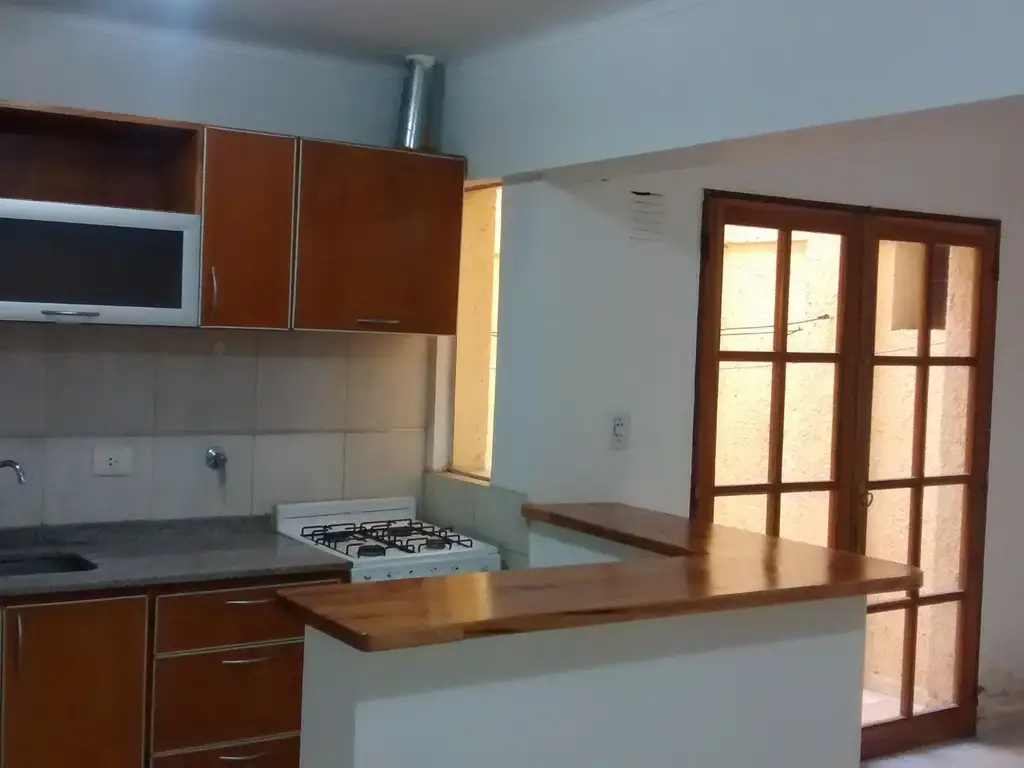 El departamento se ubica en planta baja, consta de cocina con desayunador de madera en roble en forma de “L”, mesada de granito natural y con doble bacha de acero, el bajo mesada de roble con dos puertas y tres cajones, la alacena de roble con campana y, termotanque de 55 lts de alta recuperación. Estar comedor con puerta de ingreso principal de madera un plafón circular externo y una puerta de madera con salida al patio de dos hojas con ocho vidrios cada hoja. 1 dormitorio con placar, ventana con vista al patio de dos hojas de seis vidrios cada hoja. Baño con inodoro, bidet, la bacha de acero inoxidable con la mesada de mármol travertino y una mampara de vidrio de 1,60 mts. accesorios de acero inoxidable: jabonera, porta cepillo de dientes, porta rollo, toallero en el sector de la ducha. Patio de 9 mts embaldosado.