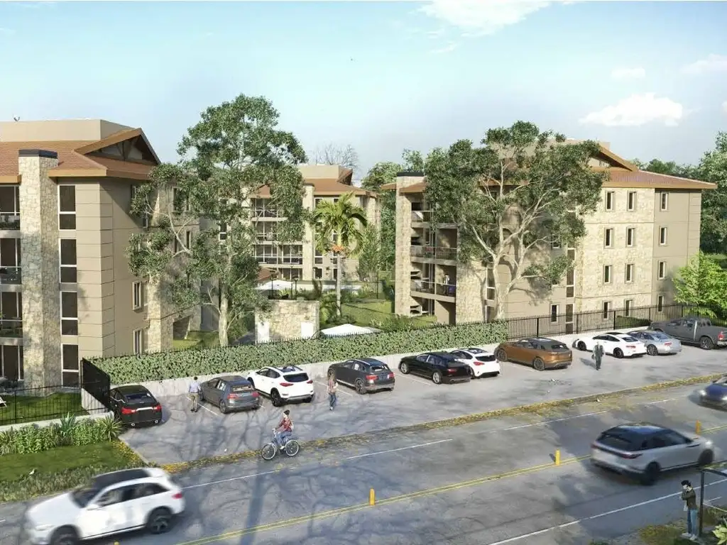 Complejo residencial rodeado de naturaleza, piscina exterior, salón de usos múltiples, gimnasio, espacios verdes recreativos, estacionamiento cubierto en subsuelo