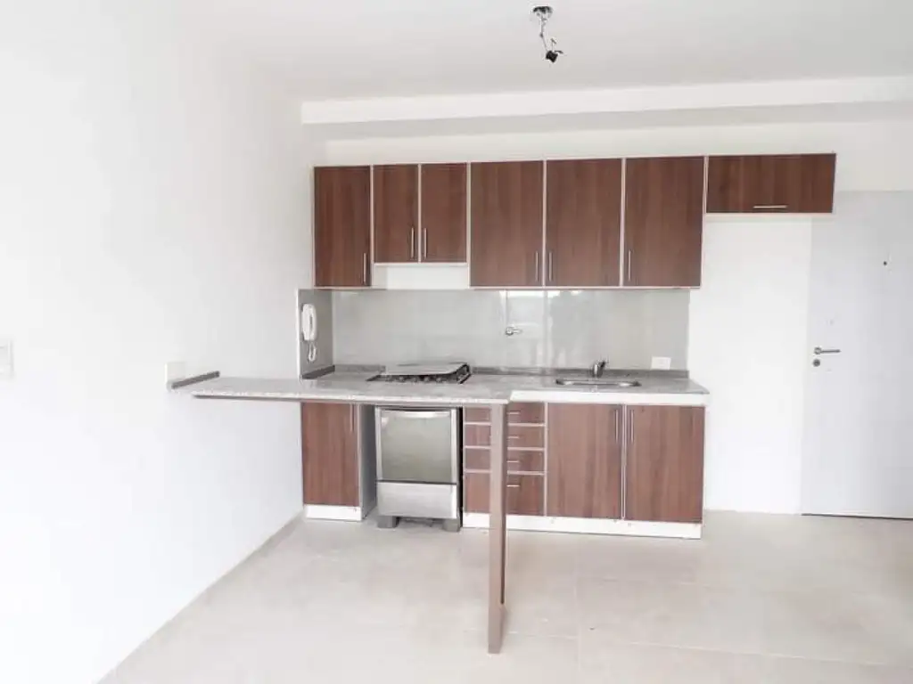 Living-Comedor con cocina integrada equipada con alacena colgante y muebles bajo mesada, mesa desayunador, balcón con espacio y preparado para lavarropas. Dormitorio con Balcón. Cochera Cubierta en sub-suelo