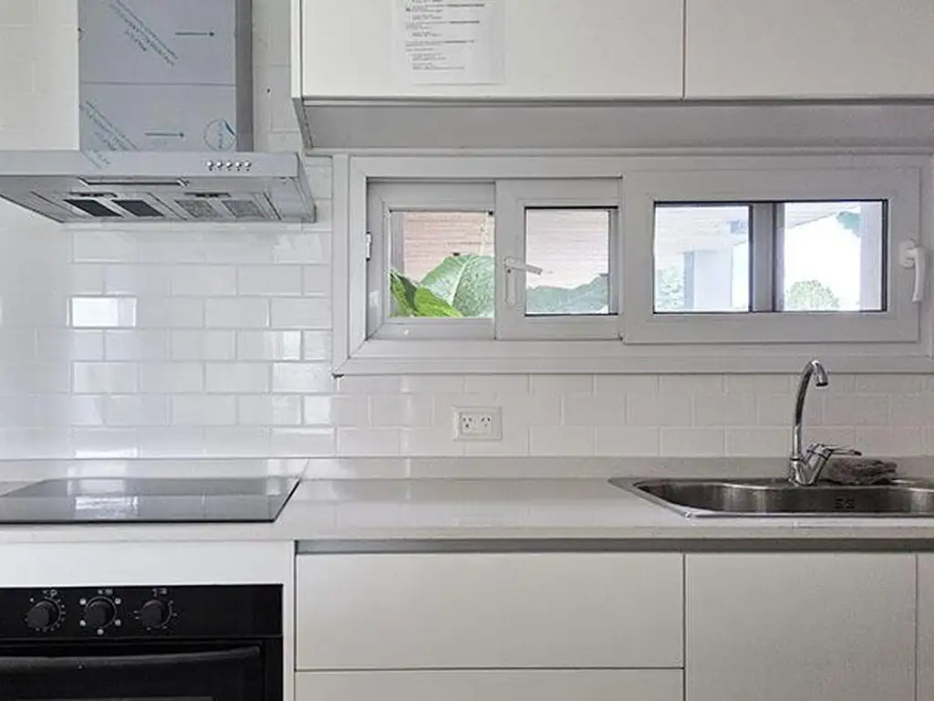 Equipos individuales frío calor instalados. Muebles de cocina e interiores de placards completos en melamina blanca. Anafe vitrocerámico de cuatro hornallas y horno eléctrico negro de 5 funciones, extractor con salida al exterior marca TST.