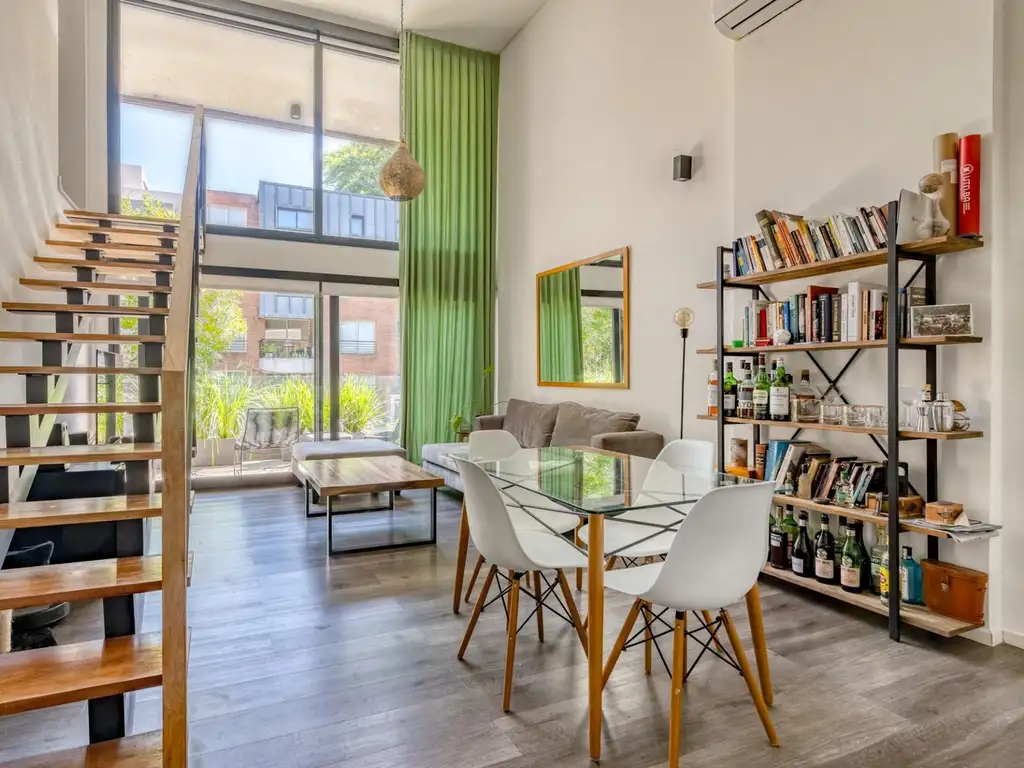 Este moderno y cómodo departamento en una calle tranquila sin salida, a metros de Av. Libertador, ofrece un diseño funcional en dos plantas. Cuenta con dos dormitorios en suite, ambos con placares amplios, una cocina moderna e integrada con espacio para lavavajillas y lavarropas, anafe eléctrico vitrocerámico y horno eléctrico empotrado. El living-comedor se destaca por su doble altura, cortinados eléctricos a medida y una barra desayunadora con espacio de guardado.