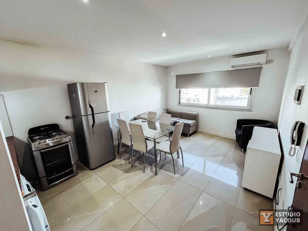_ El mismo posee cocina equipada con muebles bajo mesada integrada al living comedor, un baño completo y dos dormitorios con placard empotrado y pisos flotantes de madera. Amplio y luminoso, cuenta con balcón y terraza de uso privado.