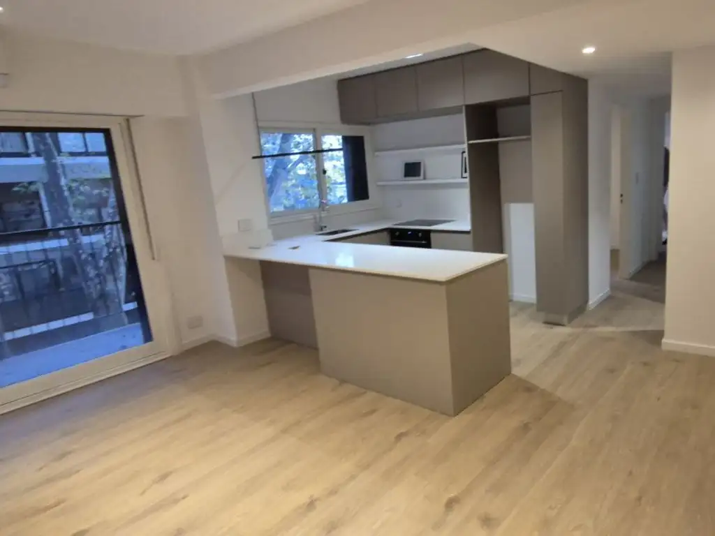 Espectacular unidad de 3 ambientes completamente renovada a nuevo: pisos, instalaciones, revestimientos, griferías y más. Cocina integrada con horno eléctrico Longvie y anafe Samsung. Baño completo + toilette. Aire acondicionado instalado. Muebles de cocina de excelente calidad. Muy luminosa - orientación noroeste.