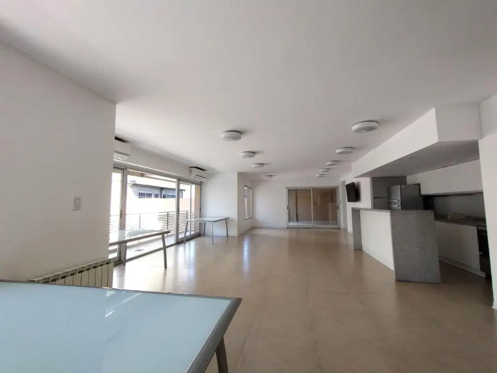 Monoambiente integrado con amplio ventanal con salida al balcón en forma de "L" que contiene red protectora ideal para la seguridad de niños y mascotas. Gran iluminación y ventilación.