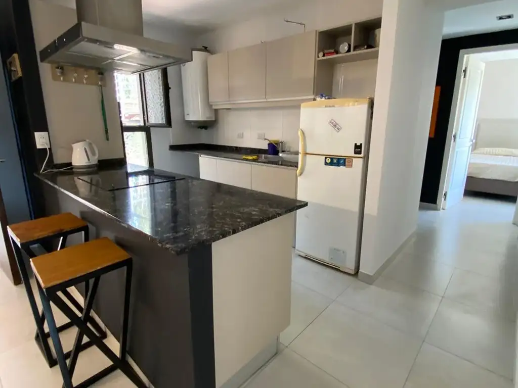 El departamento se encuentra en planta baja, cercano al portón de ingreso. Consta de dos dormitorios, baño completo con antebaño. Gran living -comedor, con cocina integrada con barra desayunadora de Silestone. Isla con anafe vitroceramico General Electrics, con bajo mesada, campana en acero INOX marca Llanos con detalles en vidrio, y horno empotrado General Electric. Toda la mesada cuenta con muebles sobre y bajo mesada. Grandes ventanales que otorgan luz natural hasta el anochecer. Patio muy amplio adoquinado con cierre perimetral verde y cerco eléctrico. Como detalles de la unidad, vale destacar que se encuentra en perfecto estado de mantenimiento, piso radiante eléctrico y todas las aberturas son de aluminio de primera calidad.
