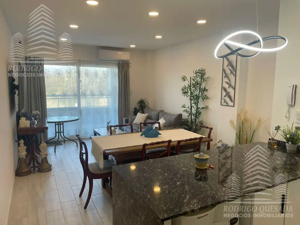 Cocina con barra desayunador: equipada, con muebles de guardado modernos y terminaciones en granito. Un rincón práctico y elegante que se conecta con la vida social del departamento.