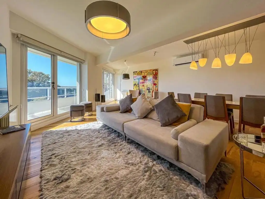 Descripcion: piso exclusivo desarrollado en el 5 piso , con vista franca la rio. Ingreso al estar comedor , pisos de madera de ingenieria. Acceso al balcon corrido con vista despejada al rio , aberturas de aluminio con DVH. Cocina independiente equipada con amoblamientos de calidad , bacha de acero inoxidable y marmol negro. Pisos de porcelanato desde la misma se accede al patio exclusivo de 76.5 m2. Toilette de recepcion.