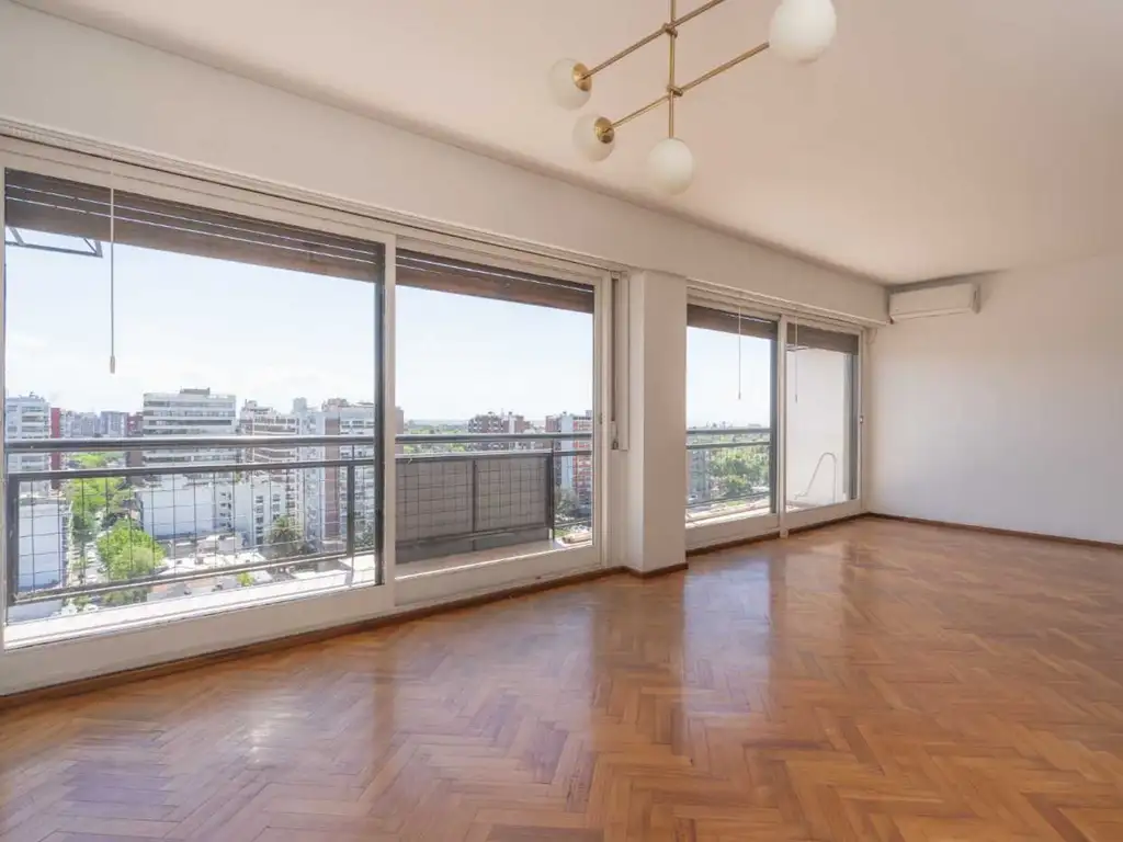 El departamento presenta una distribución funcional con living comedor apaisado, amplios ventanales y balcón corrido que permite disfrutar de una vista panorámica excepcional. Cuenta con tres dormitorios de buenas dimensiones, equipados con aires acondicionados individuales y placards. Dos baños completos, cocina comedor integrada y lavadero amplio completan la distribución interior.