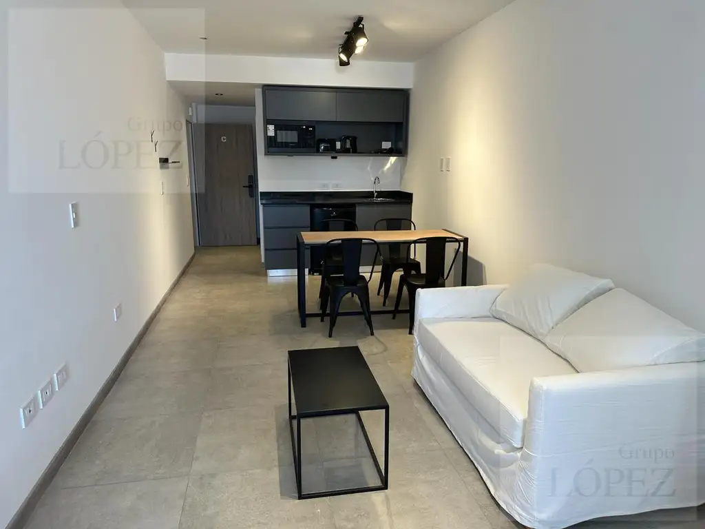 Monoambiente de grandes ventanales con salida al balcón. Cocina integrada con muebles completos bajo y sobre mesada, anafe eléctrico vitrocerámico, horno con grill marca Samsung, Aire acondicionado frio/calor ya instalado de 4.500 W. baño completo con ducha. amplios espacios comunes en planta baja.