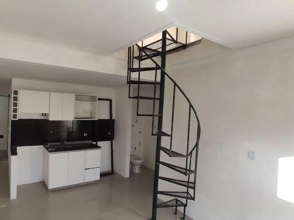 una escalera caracol en el living que sube a la 2da habitacion con un toillete en suite