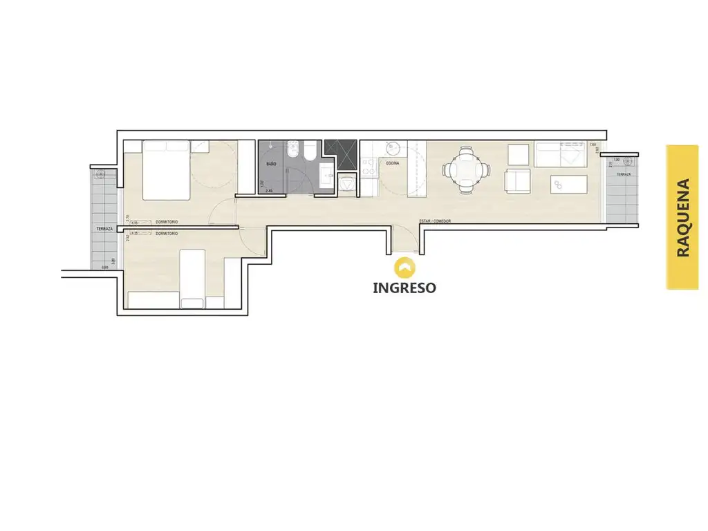 Estar comedor con cocina integrada completamente equipada, dos dormitorios independientes y baño completo. En unidades de primer nivel algunas tipologías incluyen patio o terraza ampliada. Preinstalación para aire acondicionado y previsión técnica para calefón eléctrico y lavarropas. Aberturas con vidrio Low-E y DVH según orientación. Persianas enrollables en dormitorios.