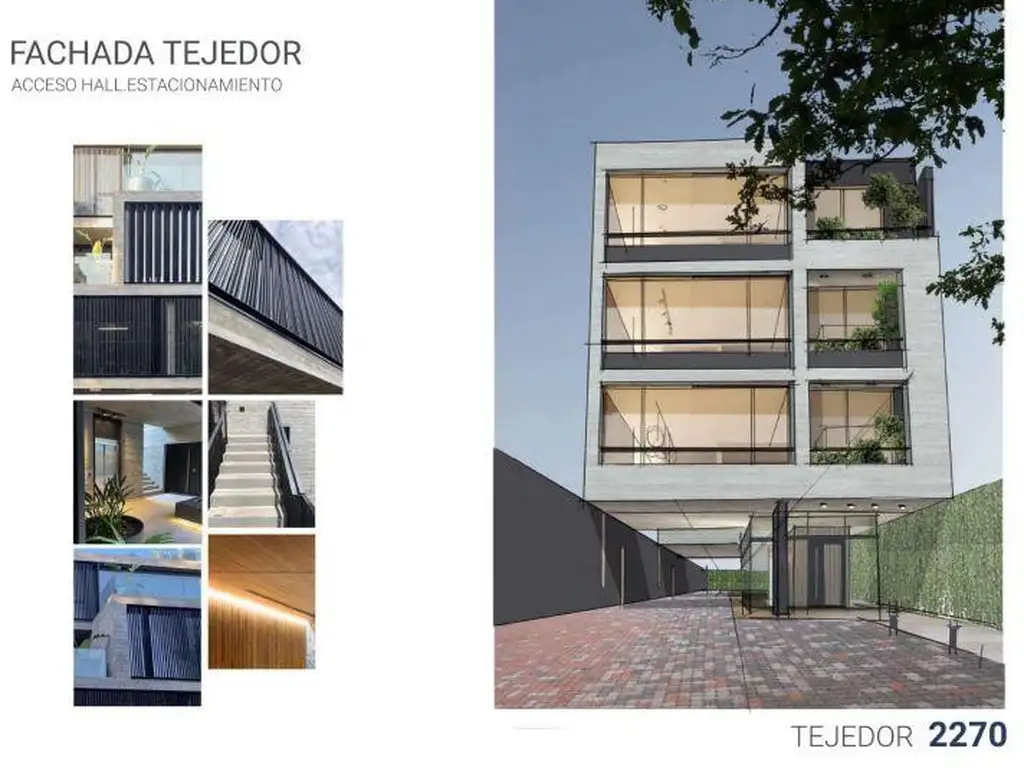 El edificio presenta una fachada contemporánea, líneas puras y materiales nobles, con un hall de acceso elegante y espacios comunes pensados para la vida urbana actual.