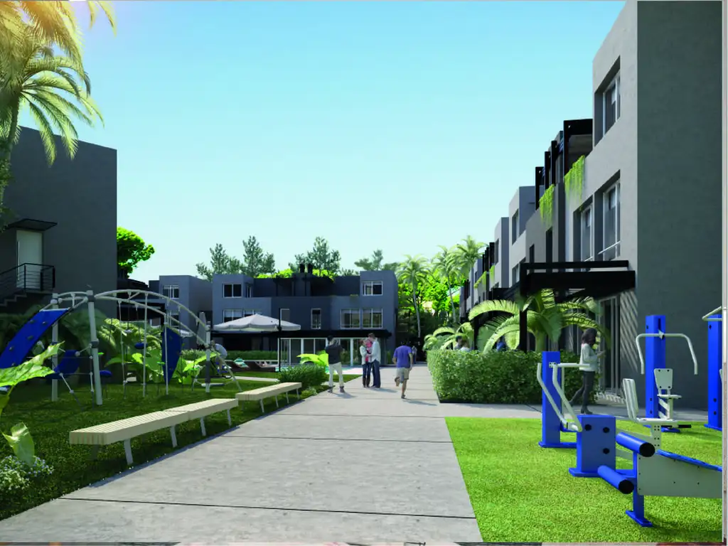 Los sectores comunes están en el centro del complejo y en el extremo se ubica la plaza con juegos y las postas aeróbicas.