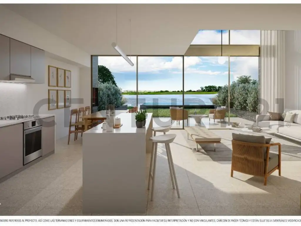 Hall de acceso y toilette de recepción, cocina con isla, comedor, living de doble altura con vista al lago y salida al exterior. Galería semicubierta de 21 m2 con parrilla, jardín privado de 88 m2 con piscina.