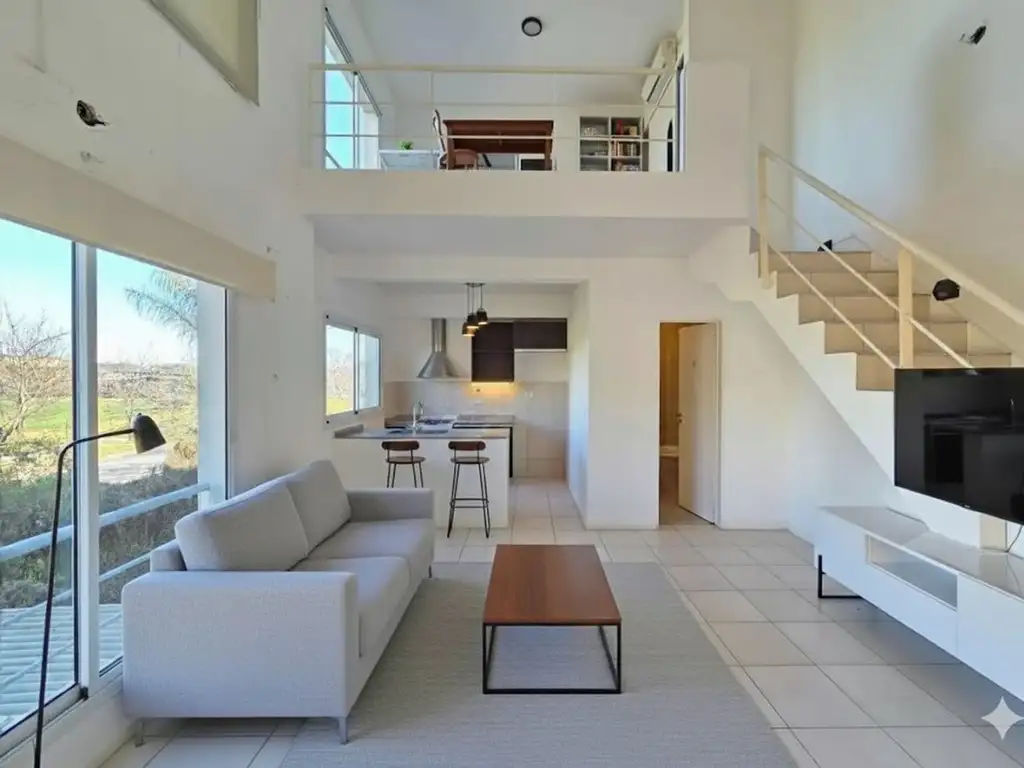 El departamento está ubicado en un entorno de barrio cerrado con proximidad a espacios verdes y colegios. El ingreso principal conduce a un living-comedor de doble altura, con amplios ventanales que brindan iluminación natural y vista al exterior. El piso de este ambiente es de cerámica. Desde el living-comedor se accede a la cocina, a un baño completo y a la escalera que lleva al dormitorio en la planta superior.