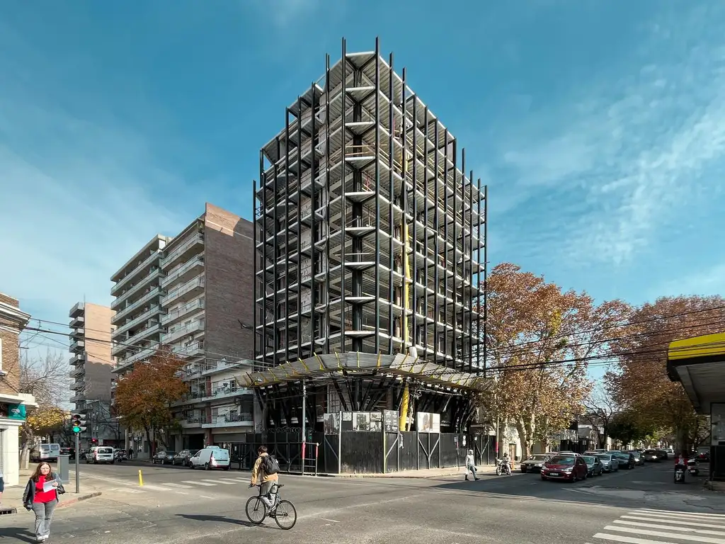 Edificio de diseño emplazado en esquina con unidades de 1, 2 y 3 dormitorios con perfecta distribución de planta, todos los departamentos al frente con balcones. 2 unidades exclusivas con terrazas exclusivas más parrillero con piletas propias. Opcional de cochera. Edificio de vanguardia arquitectónica con estructura metálica y terminación de calidad. Calefacción a través de caldera BAXI, cañerías REHAU y radiadores, instalación de cañerías para equipos de aire acondicionado split, previsión de ubicación oculta de las unidades condensadoras, muros de ladrillo de hormigón celular alta performance térmica y acústica, cubiertas con aislación térmica 4cm alta densidad y hormigón de pendiente alivianado con perlitas de poliestireno expandido. Pisos de porcelanato 60 cm por 120 cm en combinación con pisos Hygge Flooring WPC madera (Noruega), zócalos de madera Blancos con 10cm, zócalos cerámicos y/o graníticos exteriores y cocinas. Aberturas de aluminio Aluar A30New, anodizado natural VIDRIOS DVH de alta prestación, marcos de chapa DDN 18 para puertas placa con bisagras y sistema de cierre suave de acero inoxidable, puerta placa Interiores con marco de chapa color blancas. Puerta Placa de Ingreso con marco de chapa color Wengue. Frentes de placar en melamina color blanca con guías de aluminio y en unidades de 2/3 dormitorios, una hoja es espejo. Cocinas con equipamiento completo en MDP con Melamina blanca Lisa, cantos de PVC 2mm y sistema de apertura perfil Gola aluminio anodizado natural, sistema de cierre suave, en unidades de 2/3 dormitorios incluye cubiertero más tacho, horno y anafe Longvie o calidad similar (campana en 2 y 3 dormitorios), bachas de acero inoxidable, mesadas en silestone o granito dependiendo de la unidad. Yesería tradicional con enlucido de yeso en paramentos interiores y Cielorrasos de yeso aplicados a la losa con buña perimetral, suspendidos en baños y cocinas. Baños con revestimiento en paredes, artefactos sanitarios y griferías de primeras marcas, ducha y/o bañera, mamparas laminadas, accesorios de toallero, portarrollos y perchas. Instalación eléctrica línea Cambre Bauhaus. Instalación de artefactos en todos los espacios comunes (incluidos balcones y terrazas de uso privado).