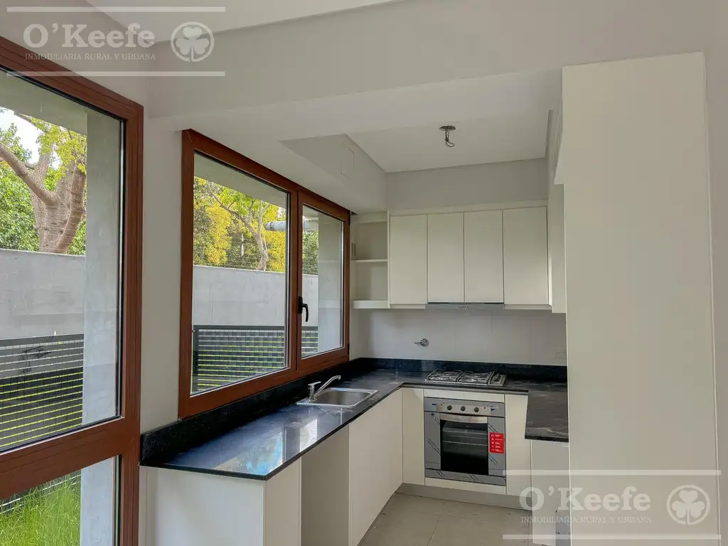 Cocina integrada con muebles de bajo mesada y alacena, con salida directa al balcón.