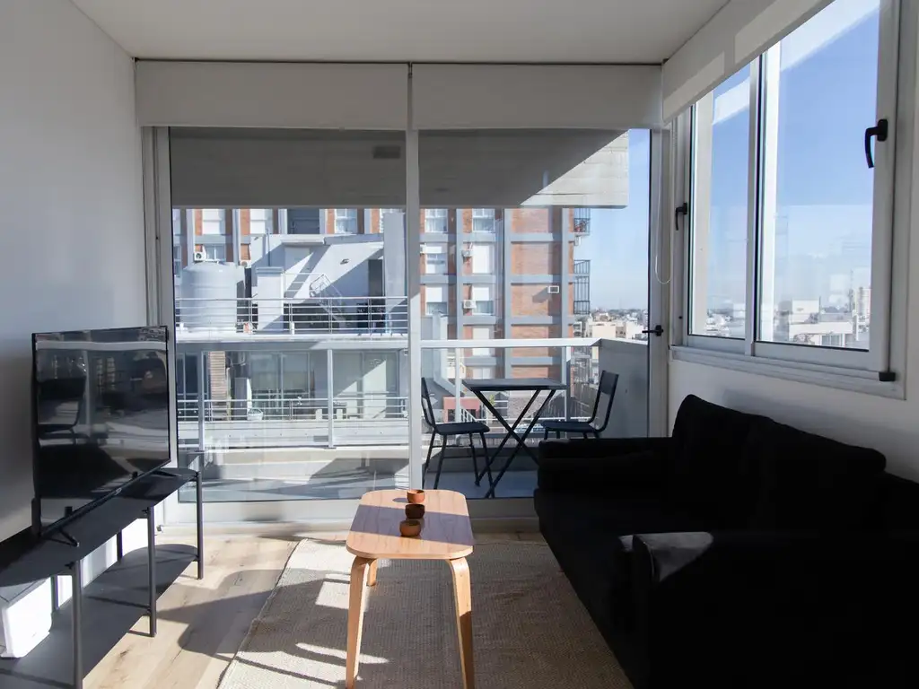 - Living comedor con cocina integrada y salida al balcón.