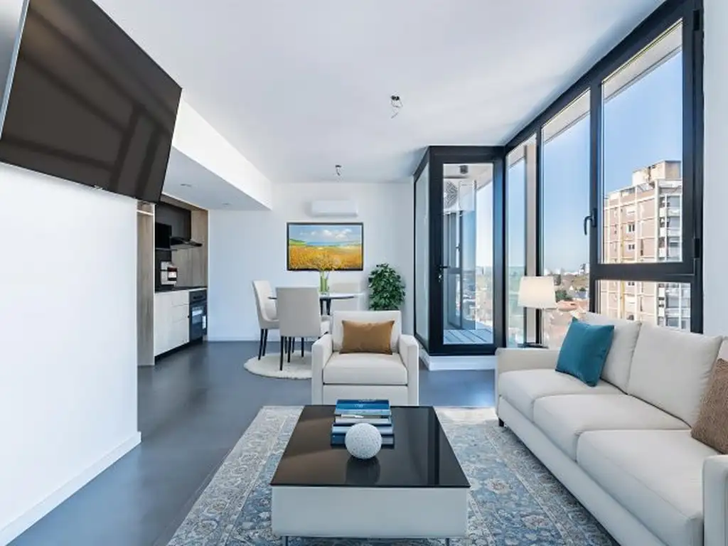 Cuenta con un Balcón al Rio y vista panorámica con protección de transparente y DOBLE VIDRIO INSONORO en toda la unidad .Edificio DELUXE cuenta con SUM y PISCINA de jerarquía.
