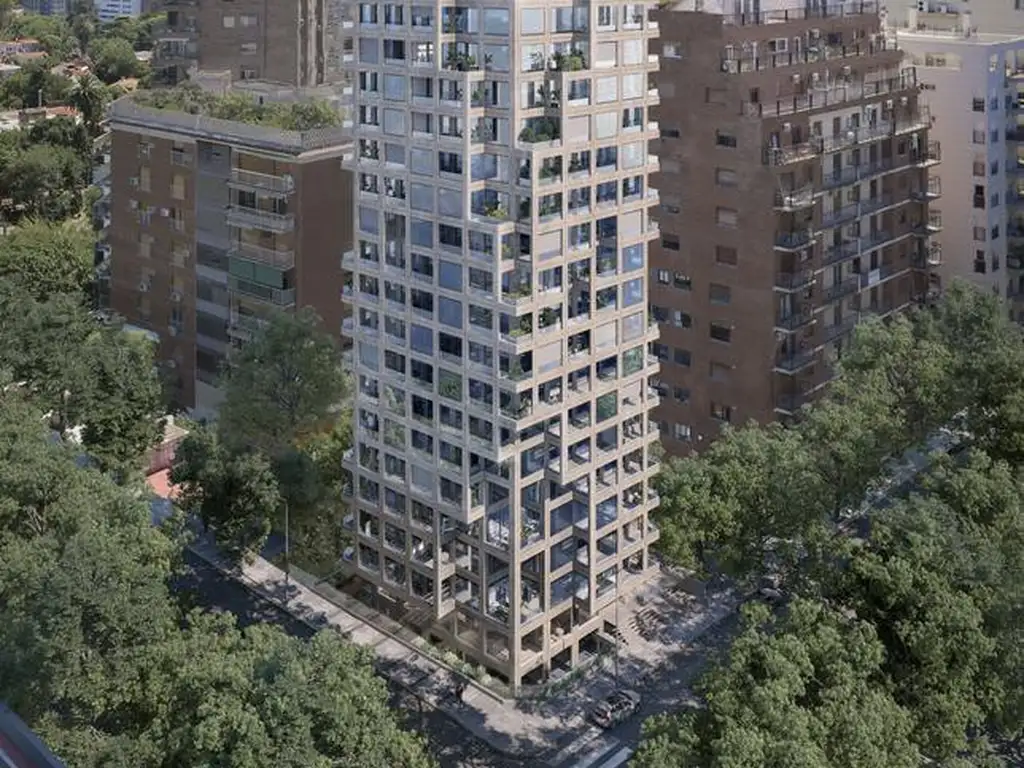 En la Planta Baja de esta unidad, se ubica el living comedor en "L", de doble altura, que se continúa espacialmente con un gran balcón terraza con tamaño para ubicar una mesa y 6 sillas o reposeras, con vista al verde del barrio, 1 de los dormitorios se ubica en este nivel, y es en suite con su propio baño completo, toilette de recepción, gran cocina integrada, con hermosa isla que sirve también de barra desayunadora, sector lavadero, dependencia de servicio con su propio baño. En la Planta Alta, se ubican 2 amplios dormitorios, ambos en suite con su propio baño, el principal con vestidor y salida a precioso balcón terraza, ideal para desayunar y leer mirando al verde.
