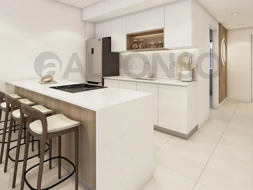 Cocina integrada con muebles bajo mesada y alacena en melamina, equipada con anafe y horno eléctrico.
