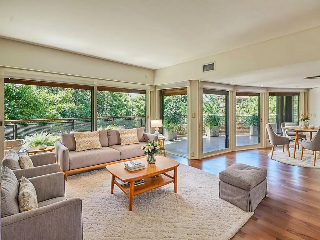Dispone de living comedor con pisos de madera y salida a balcón diseñado por Carlos Thays, con vistas a árboles como Jacarandá, Ginkgos, Liquidámbar y Fresnos. Toilette de recepción. Master suite con baño completo en mármol, ducha escocesa, jacuzzi, doble bacha y vestidor. Suite junior con baño completo. Un dormitorio adicional y un baño completo refaccionado.