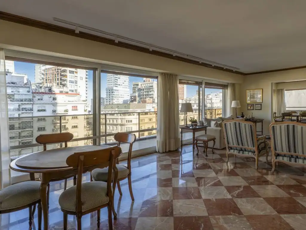 Amplio hall de entrada. Doble living con salida a balcón de 35 m² con vista panorámica a la avenida, bosques y ciudad. Comedor independiente y escritorio de buen tamaño, conformando una importante recepción. Excelente luminosidad en todos los ambientes.