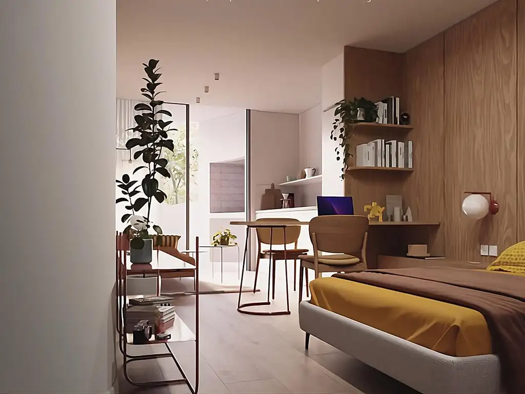 El diseño interior destaca por sus paredes curvas que optimizan el espacio y la luminosidad. El balcón integrado con parrilla es perfecto para disfrutar y socializar. Las terminaciones son de alta gama, con aberturas de aluminio A30 con DVH, climatización por losa radiante eléctrica y cerraduras electrónicas.