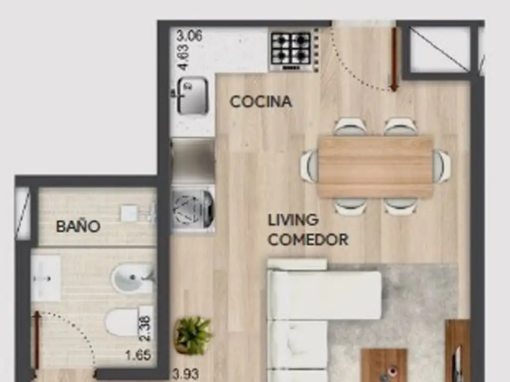 Unidad 308: Contrafrente despejado. Cuenta con cocina semi integrada al living-comedor, con salida al balcón, 2 dormitorios con placard y baño.