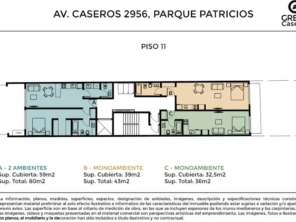 El emprendimiento se desarrolla en Planta Baja y 12 pisos, departamentos de 1 y 2 ambientes.