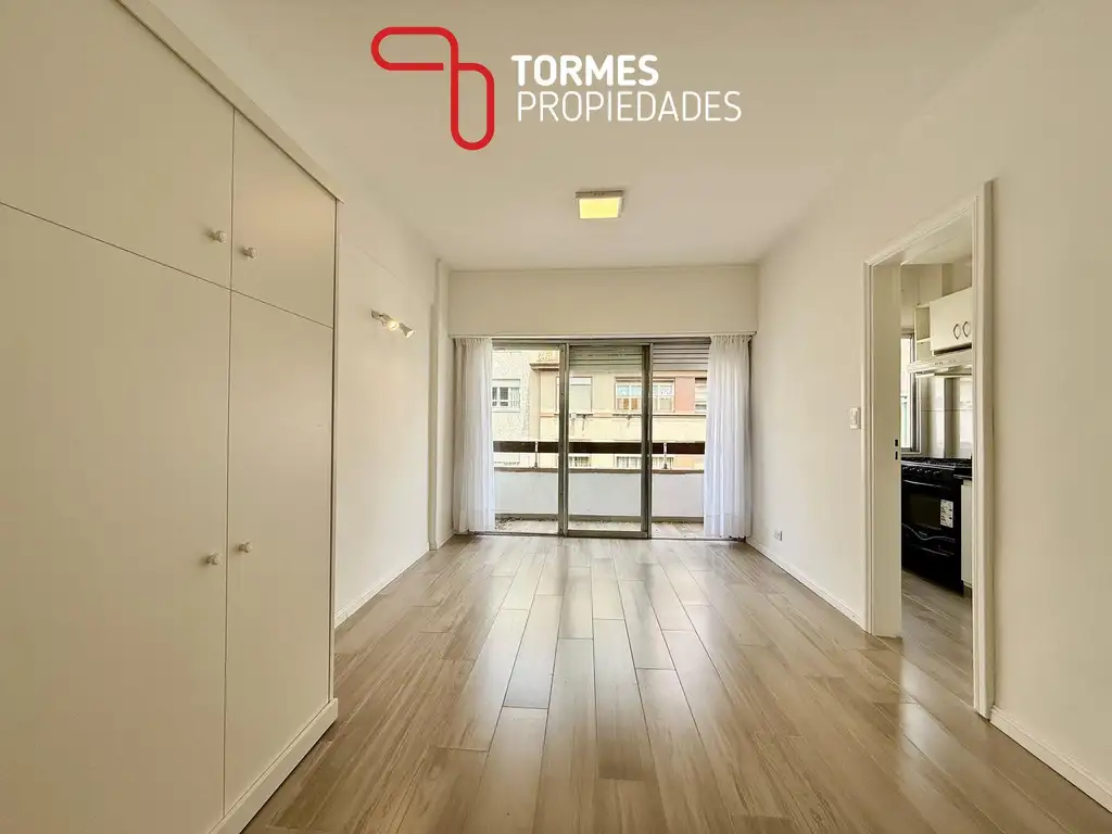 Al ingresar, el ambiente principal cuenta con pisos de porcelanato símil madera, amplio placard con baulera y cama rebatible, logrando un espacio cómodo y versátil. El ventanal aporta buena luminosidad y conecta con el balcón saliente.